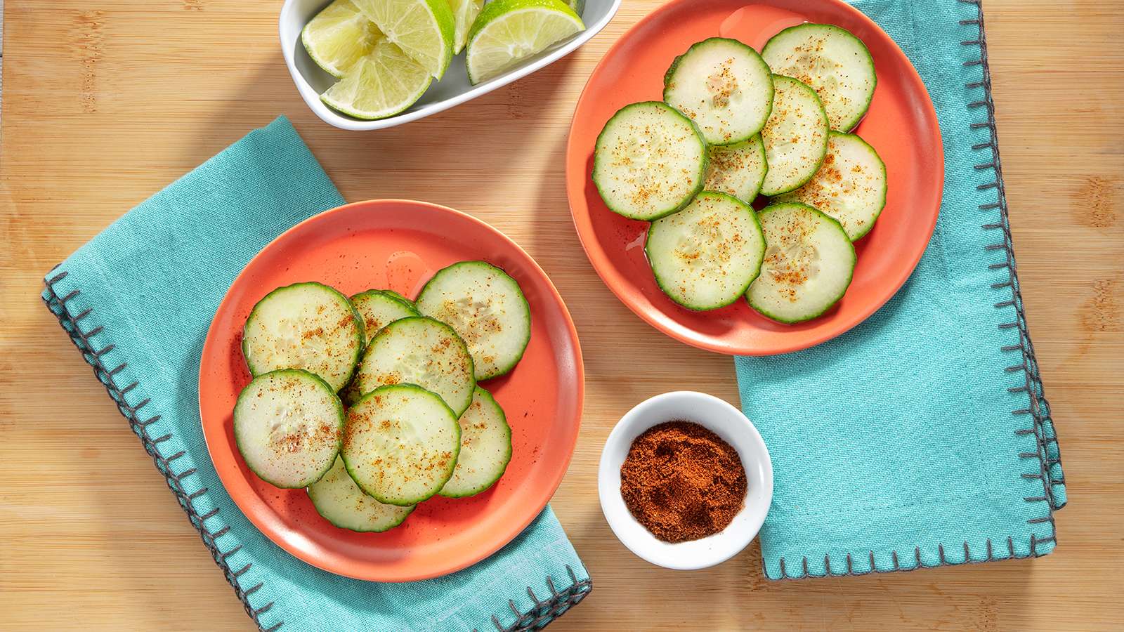 - Despliegue las rebanadas de pepino de manera uniforme entre dos platos. Espolvoree el chile en polvo sobre cada plato. Escurra cada mitad de limón sobre las rebanadas de pepino.