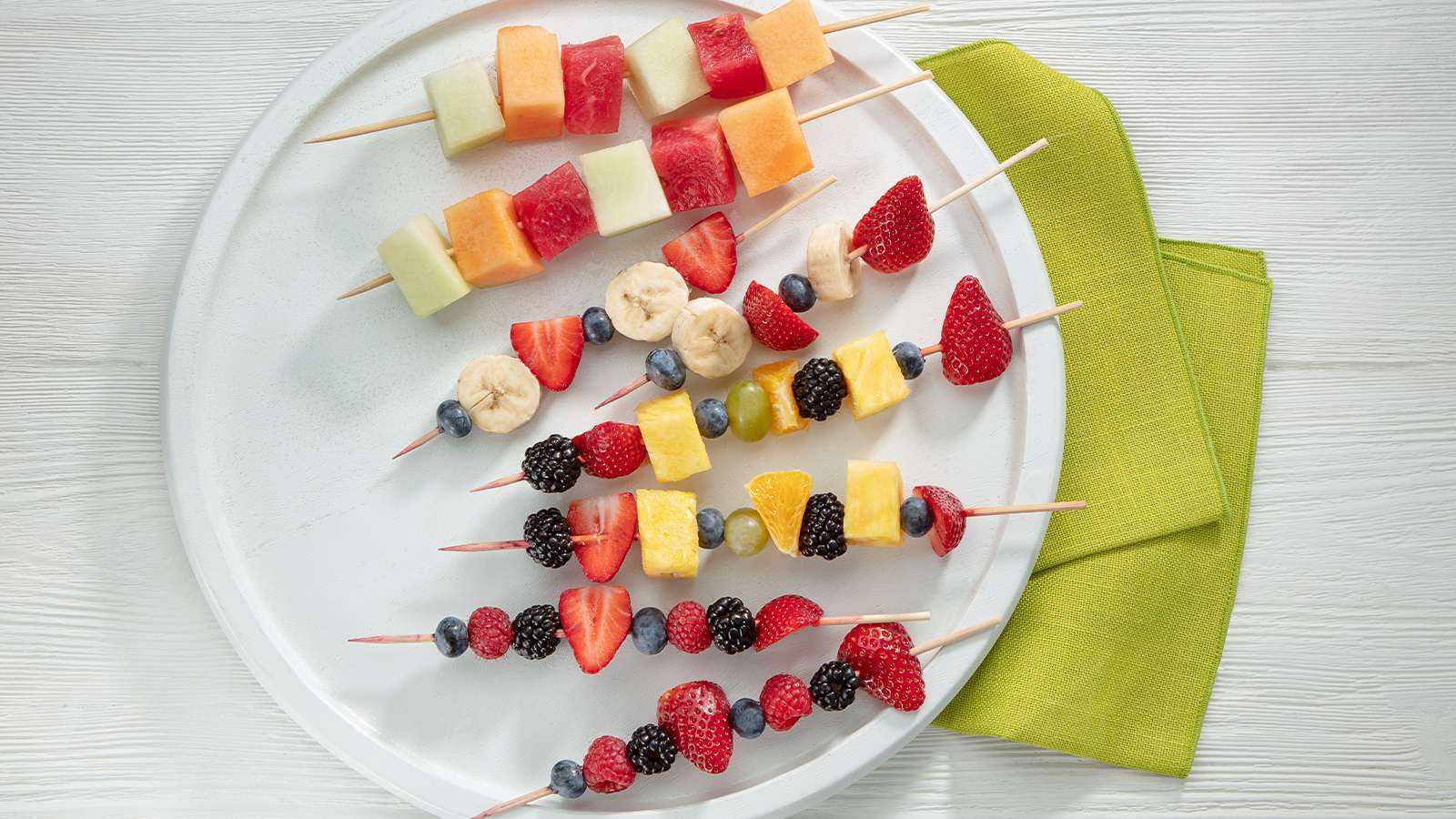- Repita hasta que la fruta esté dividida de manera uniforme entre las dos brochetas.