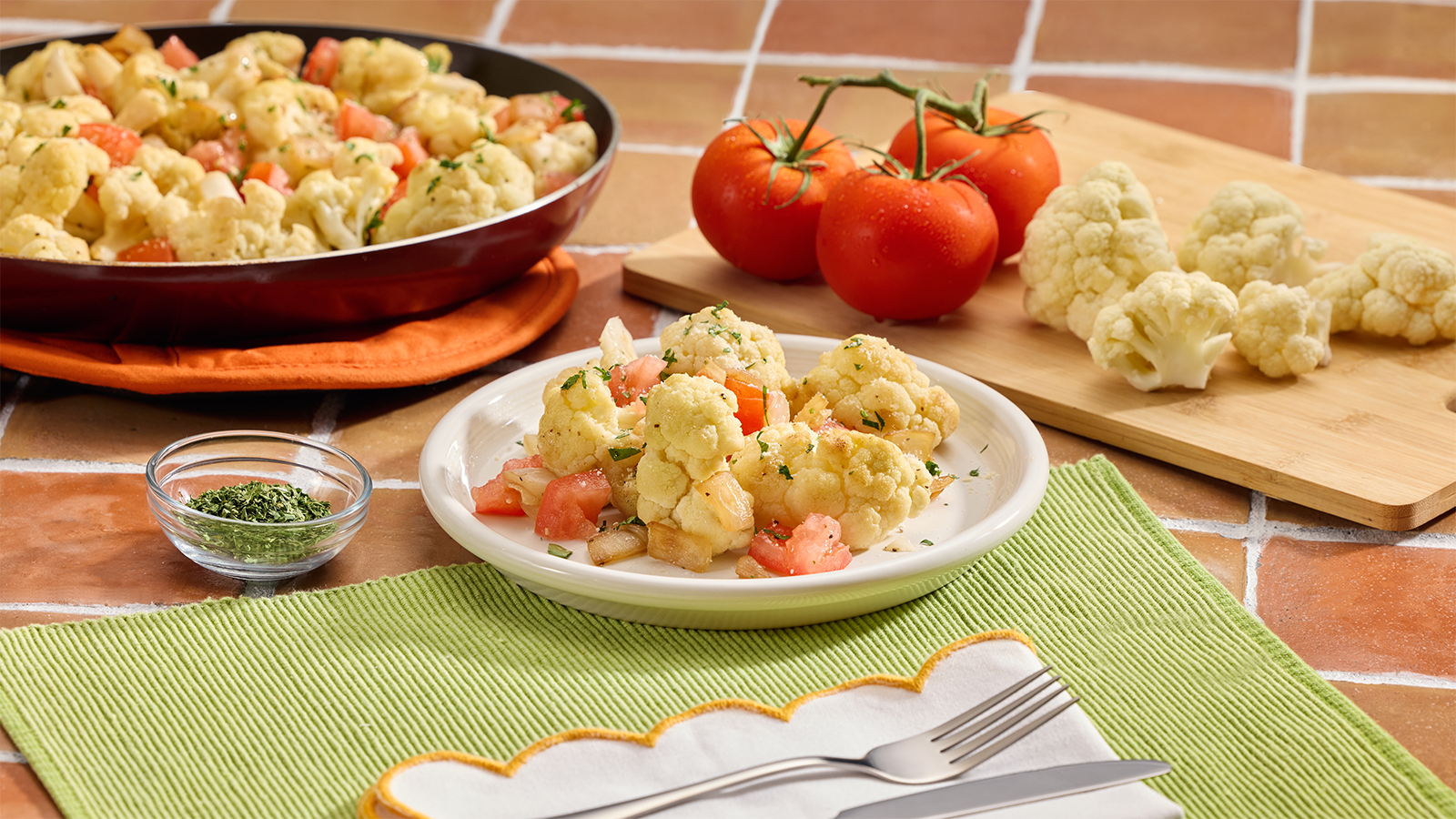8. Agregue la coliflor al sartén. Cocine, mientras revuelve, por 3 minutos, hasta que ablande un poco y empiece a dorarse.