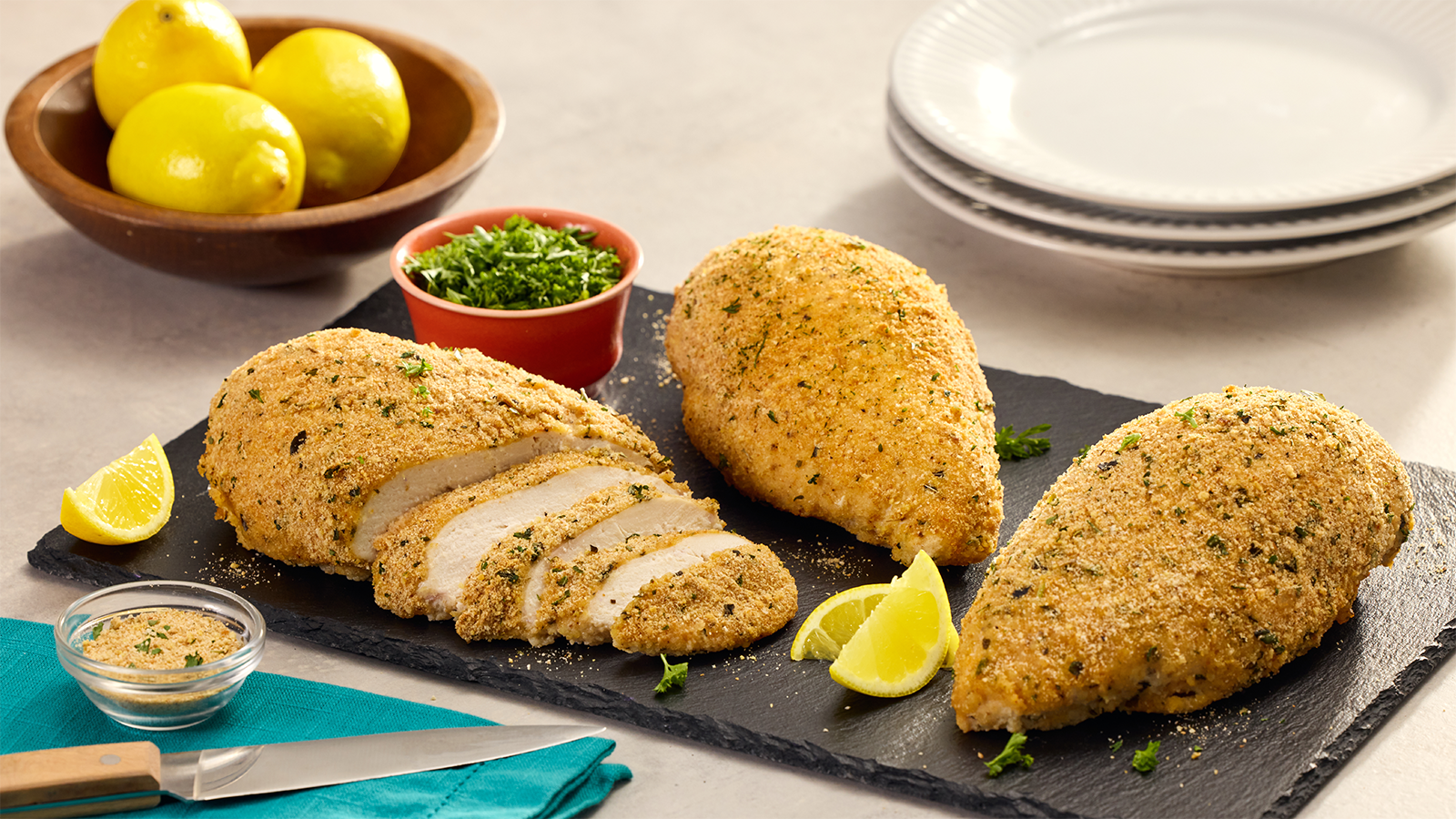 6. Revuelque las pechugas de pollo, cubiertas con yogur, en las migas de pan sazonadas.