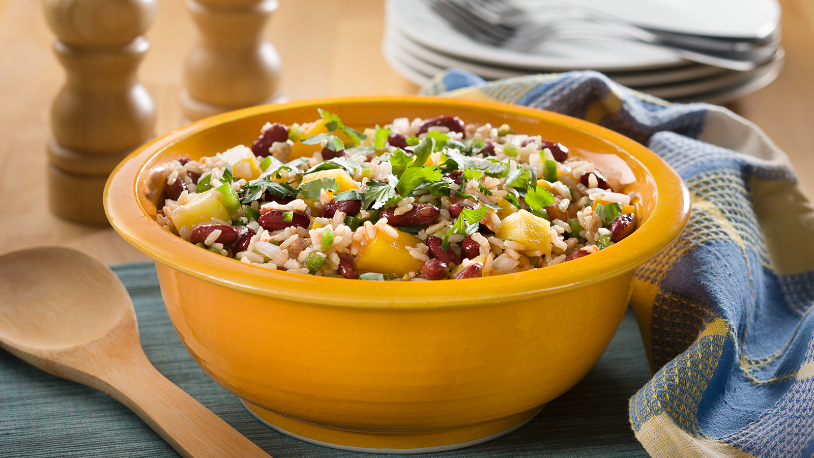 - Combine el arroz, frijoles, pimiento, mango y cebolla en un tazón grande. Revuelva con un tenedor. Incorpórelo en la salsa y espolvoree con cilantro.