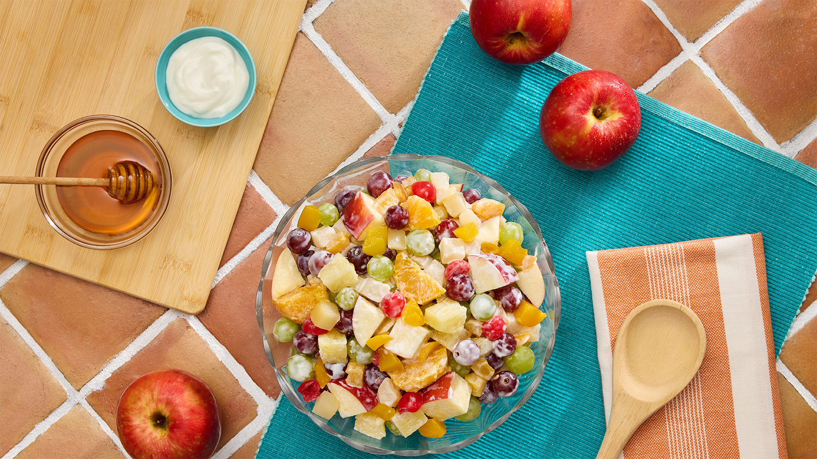 - Pon el yogur y la miel en el tazón para mezclar. Revuelve con la cuchara de madera hasta que esté mezclado. Agrega la fruta escurrida, la piña, la manzana y la naranja. Revuelve con la cuchara hasta que esté todo mezclado.Sírvelo frío.