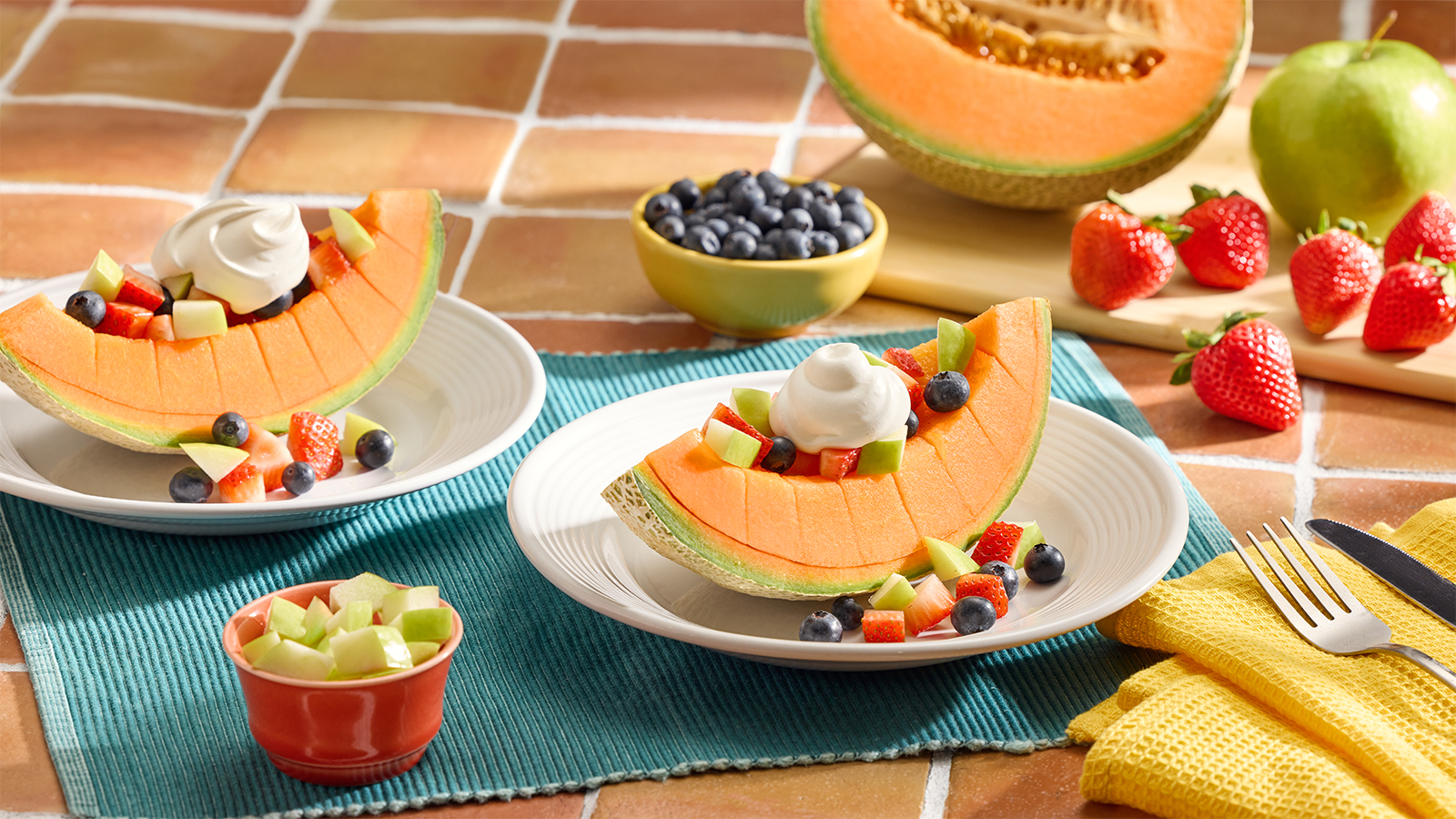 - Mezcle el melón cortado con el resto de la fruta. Vierta la mezcla de fruta en cada pieza de melón (está bien si la fruta se derrama a los lados del melón en el plato).