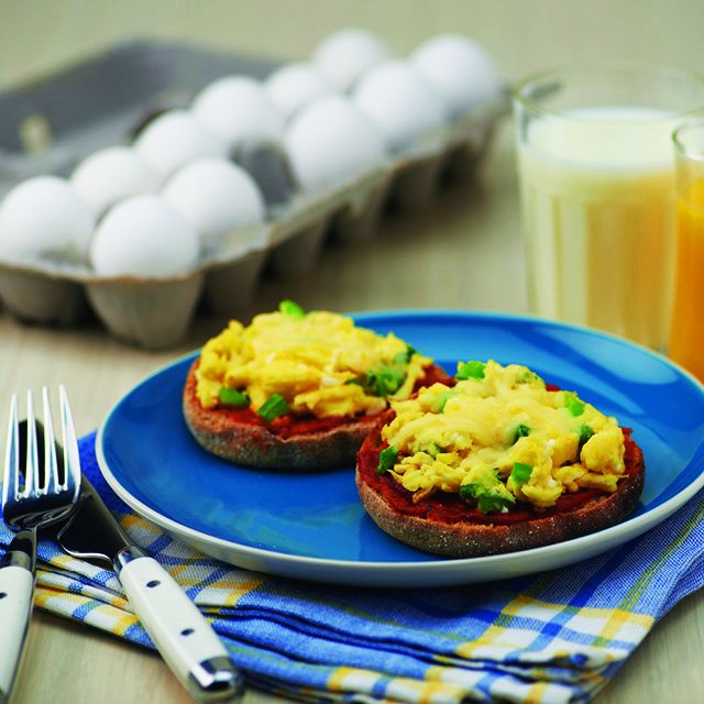 - Unte la mitad de la salsa para pizza en cada panecillo, luego agregue la mitad de la mezcla de huevo y queso.