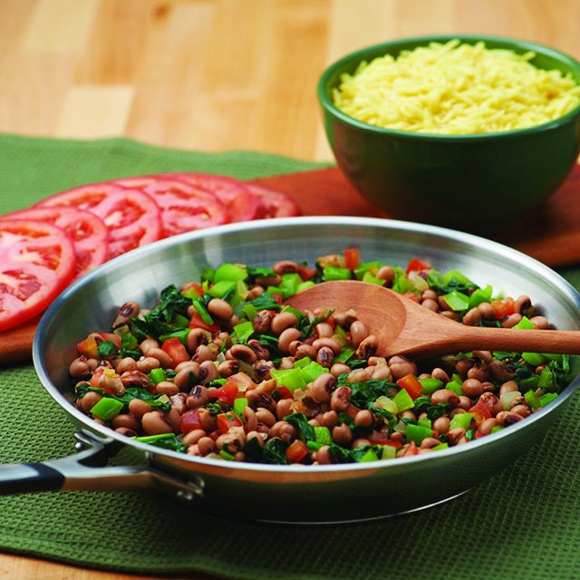 - Este platillo de frijoles a la sartén fue inspirado por los frijoles de ojo negro del sur. Esta receta pide frijoles enlatados, pero los frescos son mejores si los puede conseguir. Algunos los preferimos congelados y otros secos, pero una vez cocinados, la receta es la misma. Casi cualquier verdura se puede usar en lugar de las espinacas.