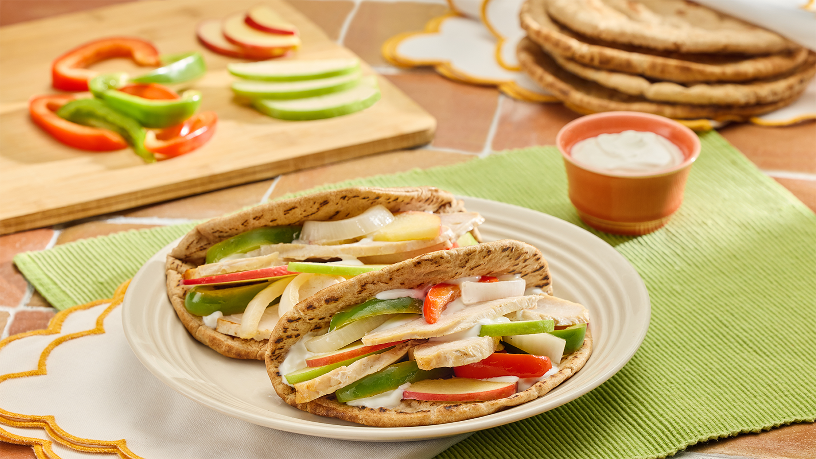 5. Doble cada pita a la mitad y rellene con la mezcla de manzana; salpique con yogur. Sirva caliente.