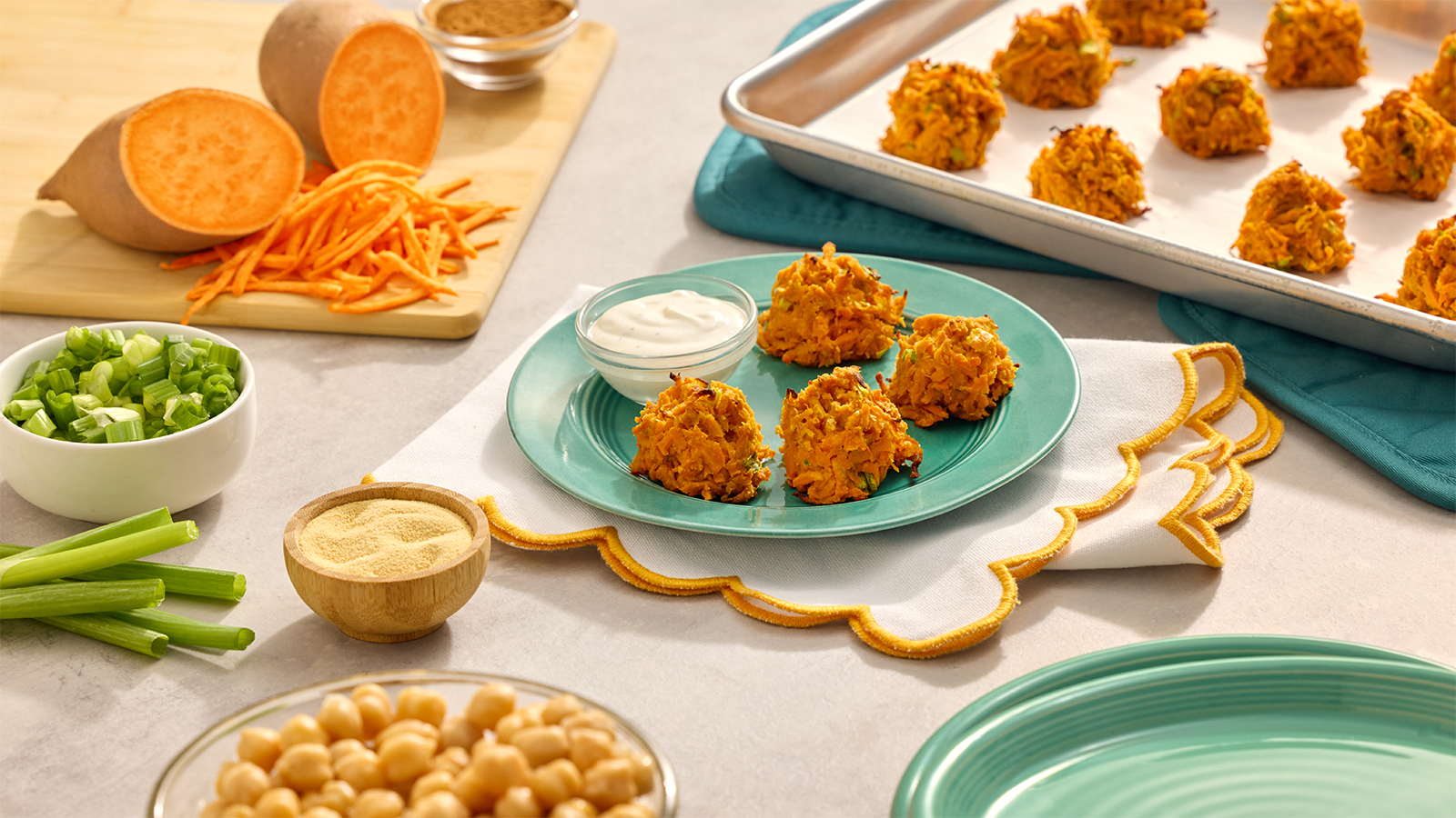 - En tazón mediano, combine los camotes, el puré de garbanzo, la cebolla verde, aceite vegetal, sal, ajo, pimienta, cebolla en polvo y canela. Mezcle bien. Cubra y refrigere de unos 40 a 45 minutos para que se puedan formar los tots.